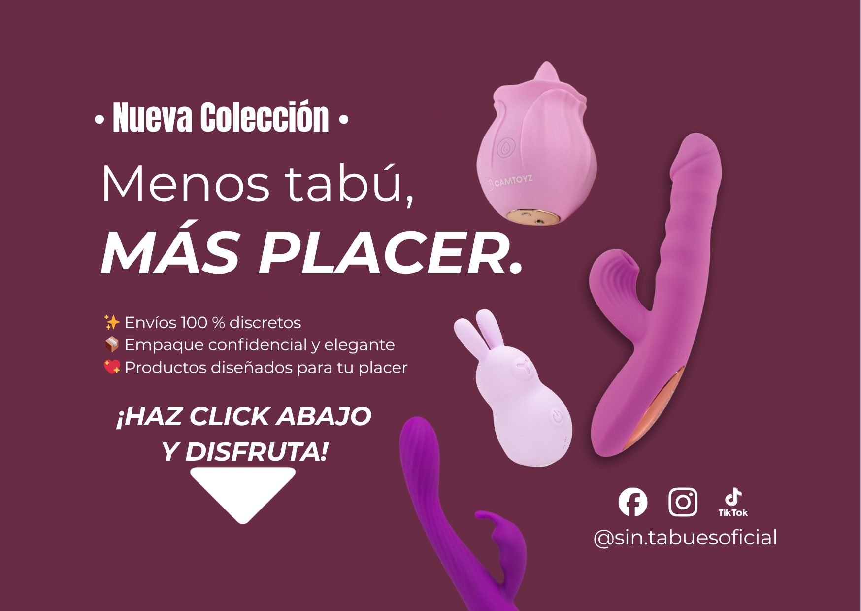 En Sin Tabúes encuentras juguetes íntimos, lubricantes, feromonas y potenciadores, todos de calidad y con asesoría cercana para elegir el ideal según lo que quieras explorar.